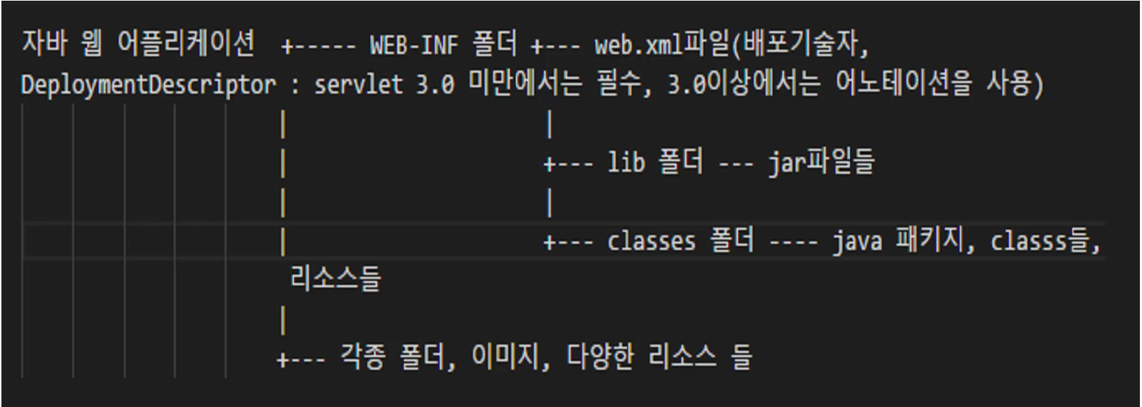 - Java 웹 어플리케이션은 WAS라는 미들웨어를 사용하므로 그에 맞는 규칙을 따라야 함