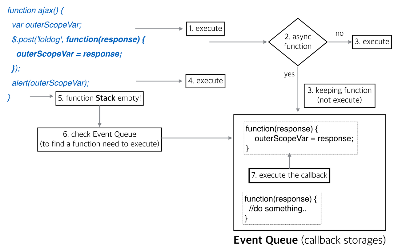 → 비동기로 실행된 익명함수는 Event Queue에 보관되다가 "load" 이벤트가 발생 (서버로부터 데이터를 받음)