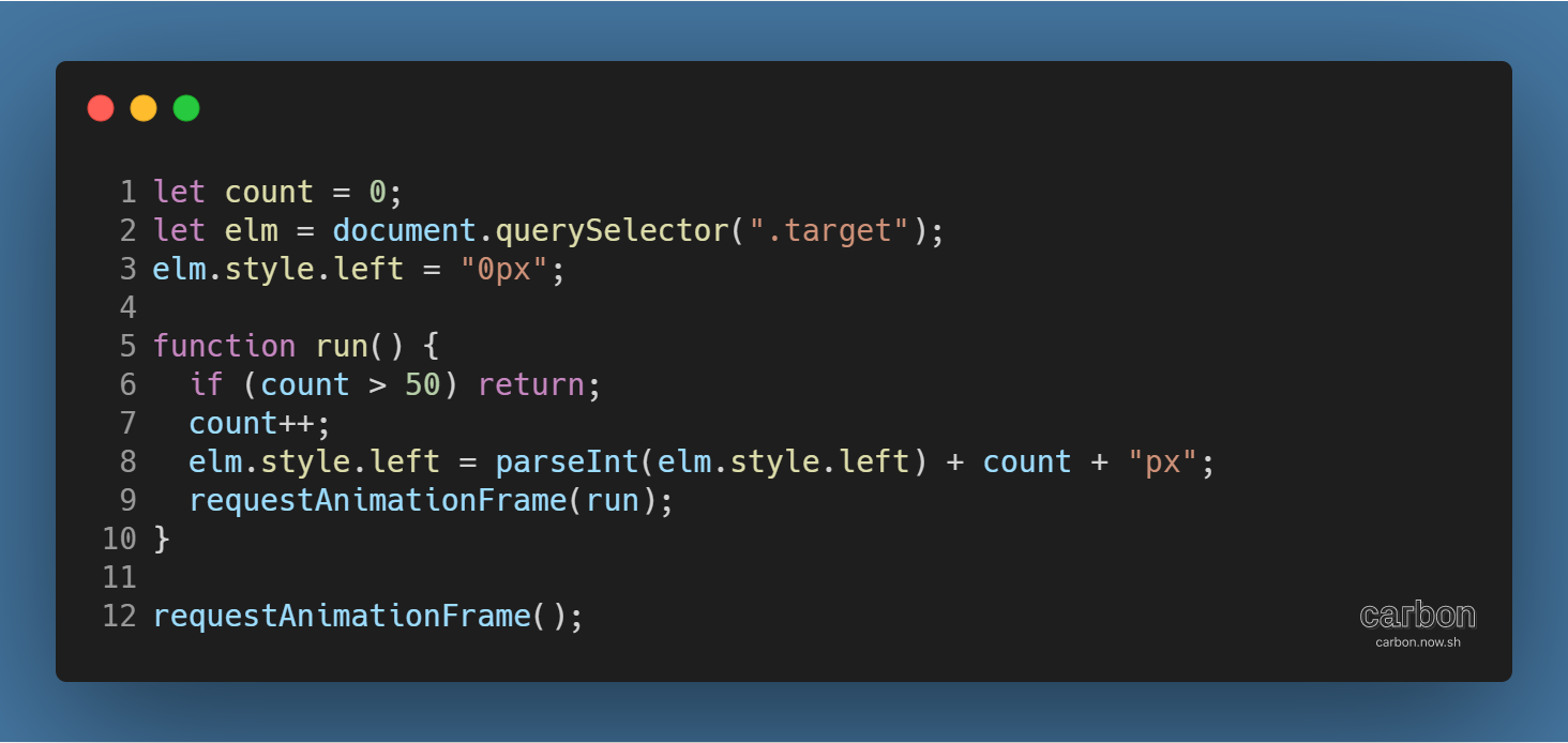 - 애니메이션에 최적화되지 않은 setInterval( ), setTimeout( ) 메서드와 달리, 애니메이션에 최적화된 방식
