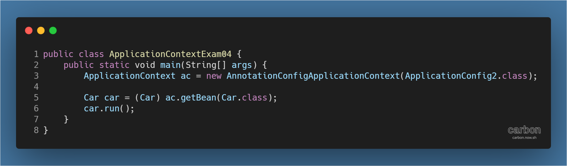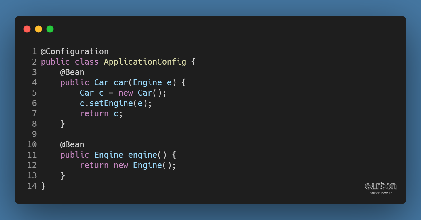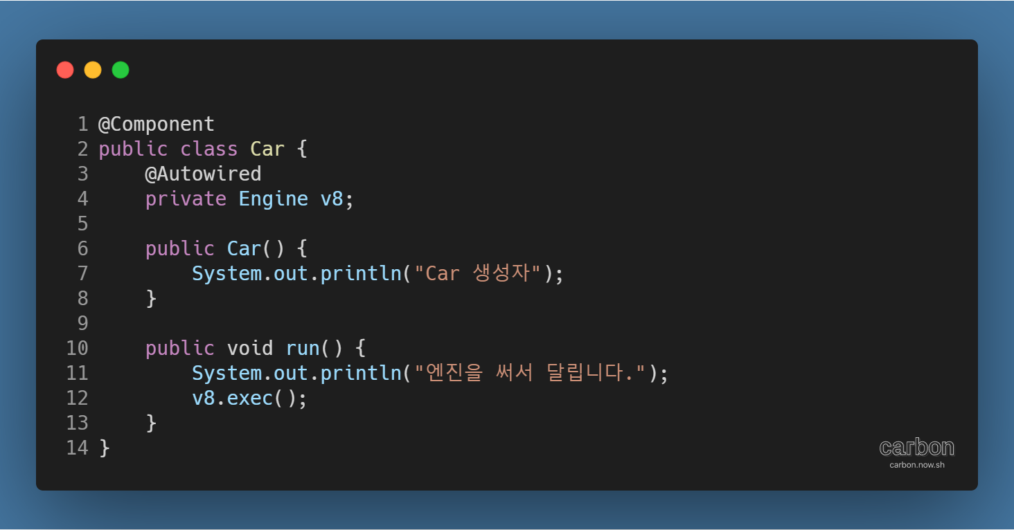 - Car 타입의 객체에 Application Config를 통해 연결된 id가 car인 bean을 불러와 실행