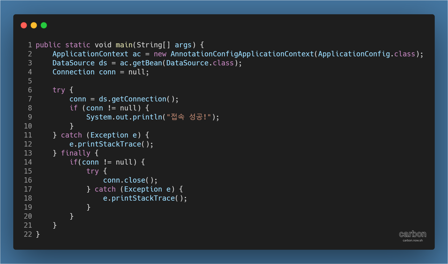 - Connection 객체를 선언한 뒤, DataSource를 통해 접속 시도
