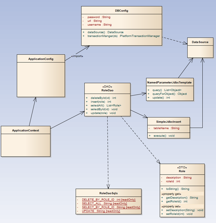 DB 연결을 위해 내부적으로 DataSource를 필요로 함 - RoleDao 생성자로 초기화된 두 객체를 이용해 RoleDao의 메서드를 구현함