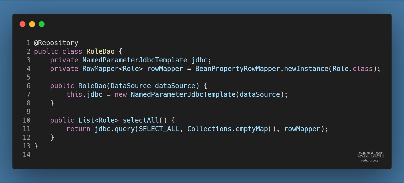 - RoleDaoSqls 클래스를 static import한 뒤, 첫 번째 인자에 SELECT_ALL 지정