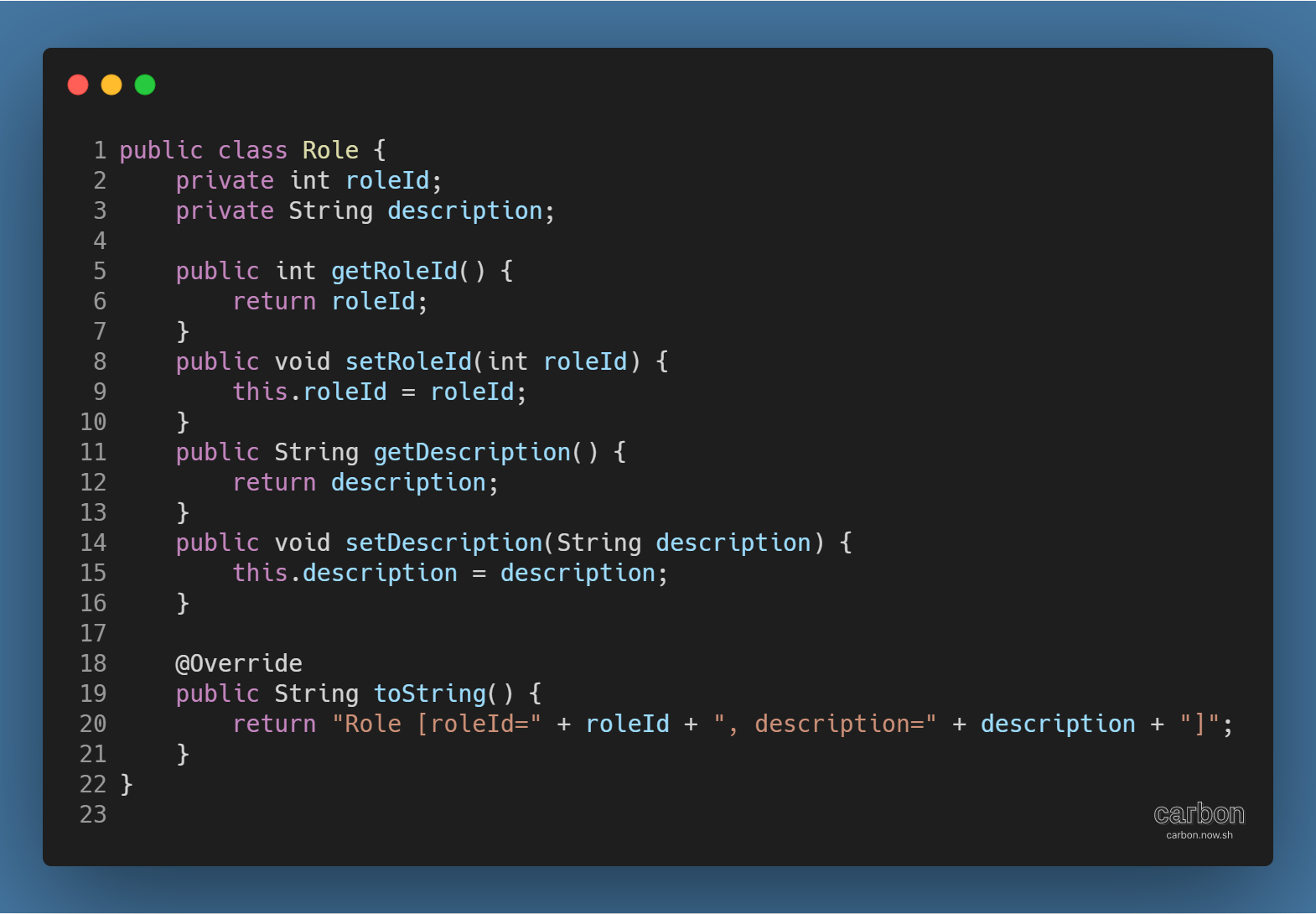 - 필드 선언: int 타입 roleId, String 타입 description