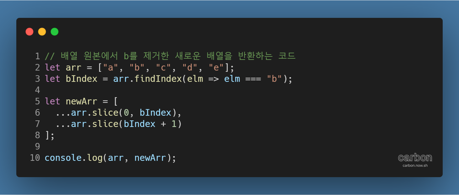 - slice( ) 메서드를 활용하여 원본 배열을 변화시키지 않으면서 특정 Index를 제거한 배열을 새로 만들 수 있음