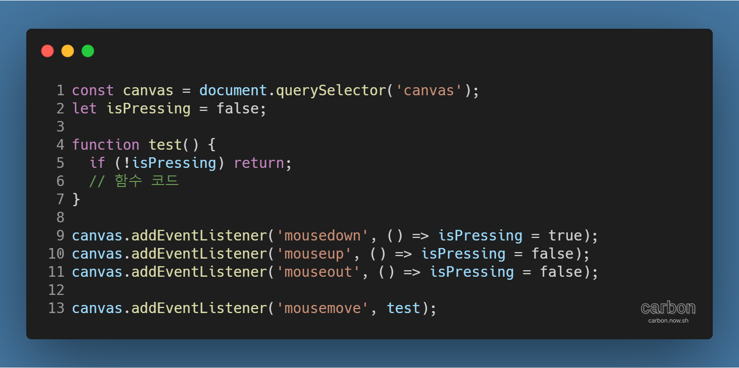 - 마우스를 움직일 때 test 함수를 실행하되, test 함수는 isPressing 변수가 false이면 실행을 멈춤