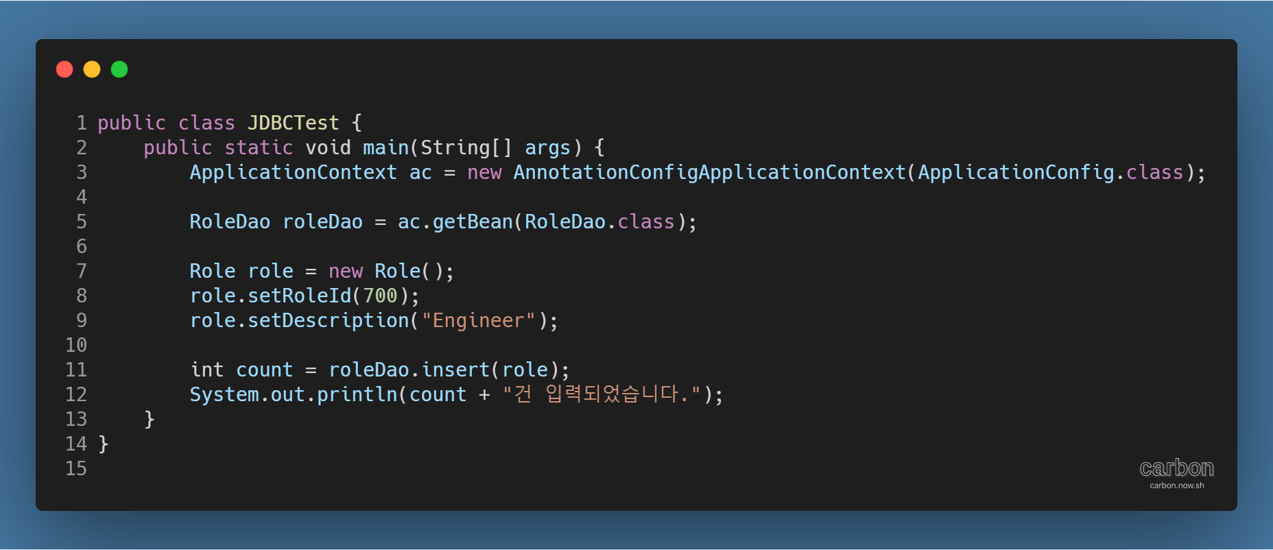- getBean( ) 메서드로 ApplicationContext에서 RoleDao 객체를 얻어냄