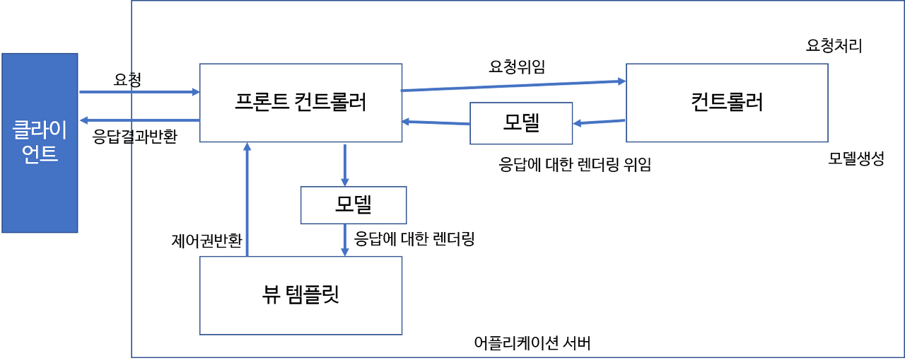 - 컨트롤러는 Bean 등을 통해 결과를 만들어내고 모델에 담아 프론트 컨트롤러에게 다시 보냄