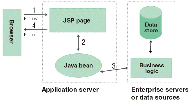 - JSP는 Java Class인 Bean을 통해 데이터베이스를 사용