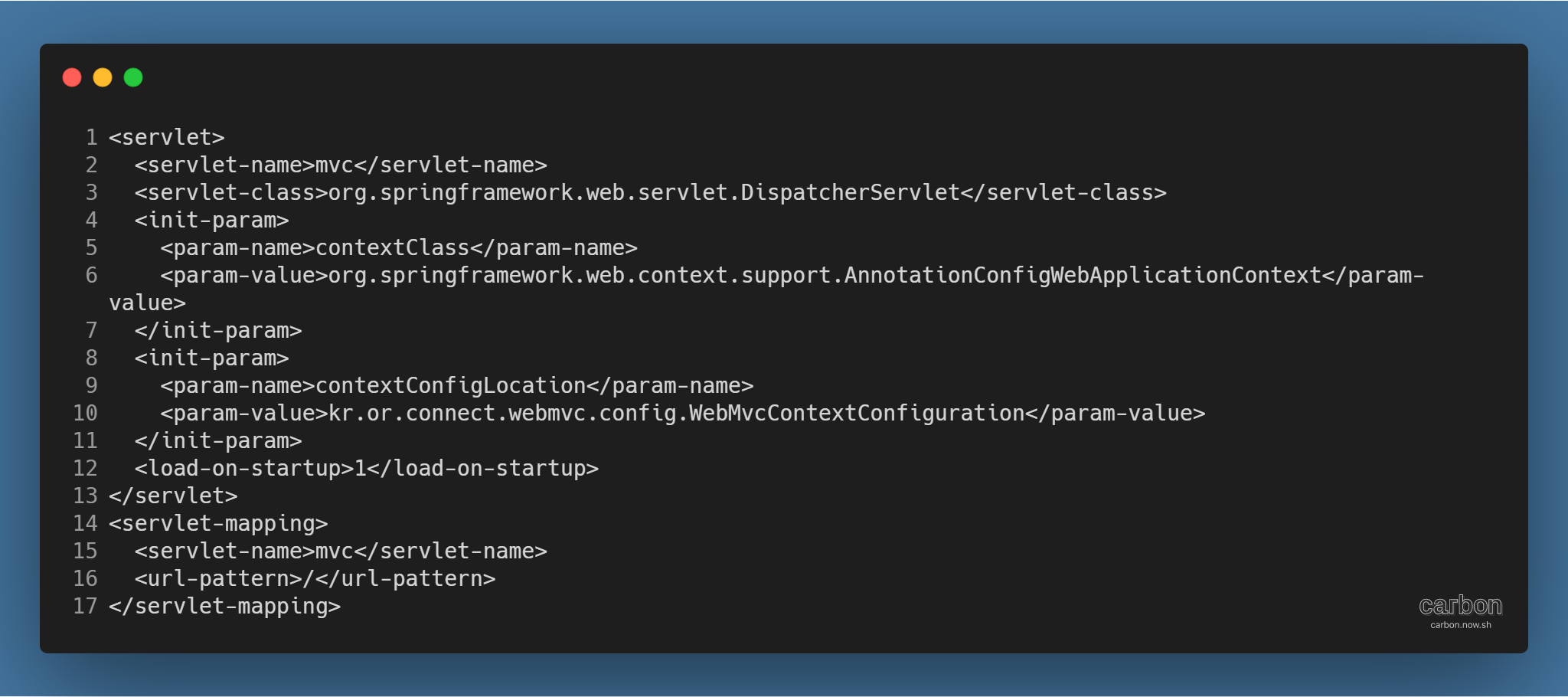 - DispatcherServlet의 설정은 web.xml로, DispatcherServlet이 읽어들일 설정은 Java Config로 함