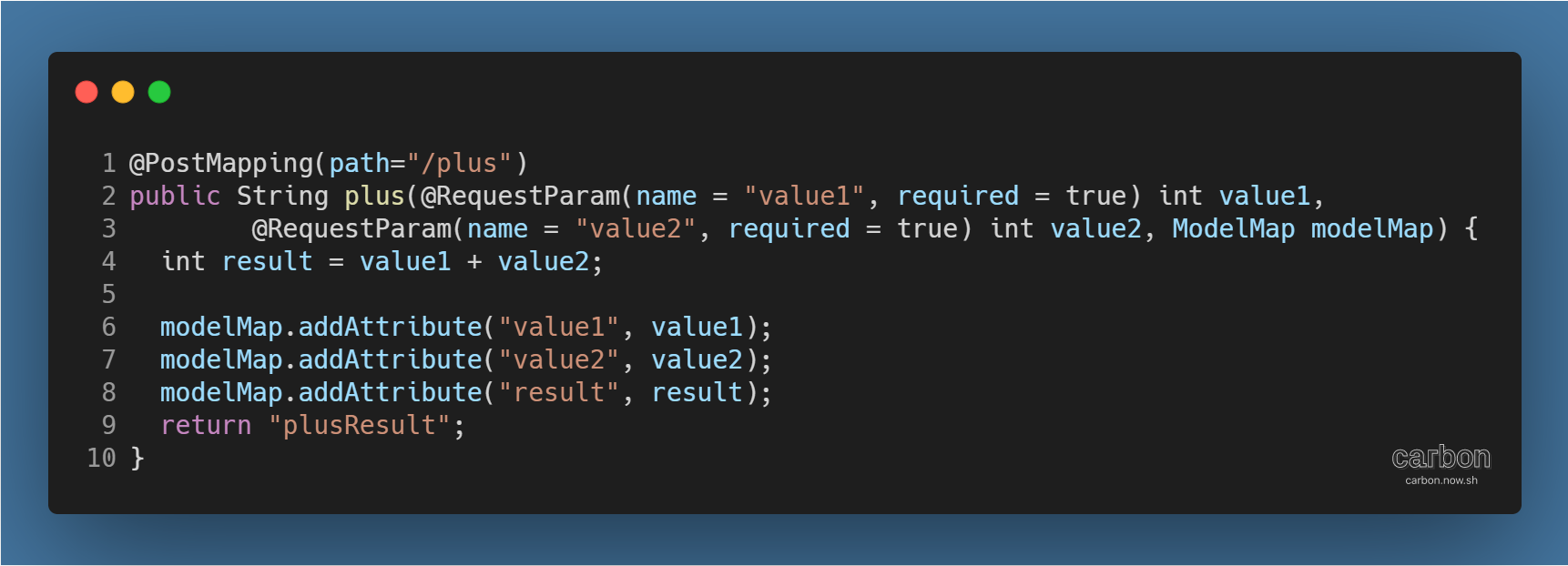 - 인자에 @RequestParam을 붙여 지정한 name을 가진 매개변수의 값을 변수로 저장할 수 있음