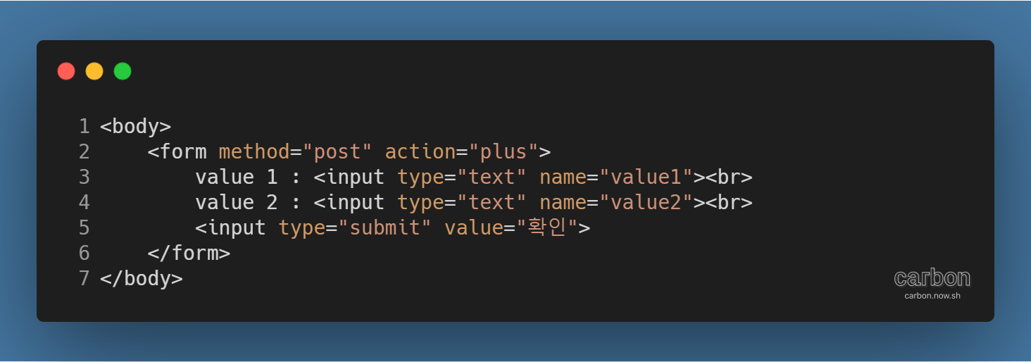 서버가 웹 브라우저에게 2개의 값을 입력받을 수 있는 입력창과 버튼이 있는 화면을 출력 - 웹 브라우저가 2개의 값을 입력하고 버튼을 클릭하면