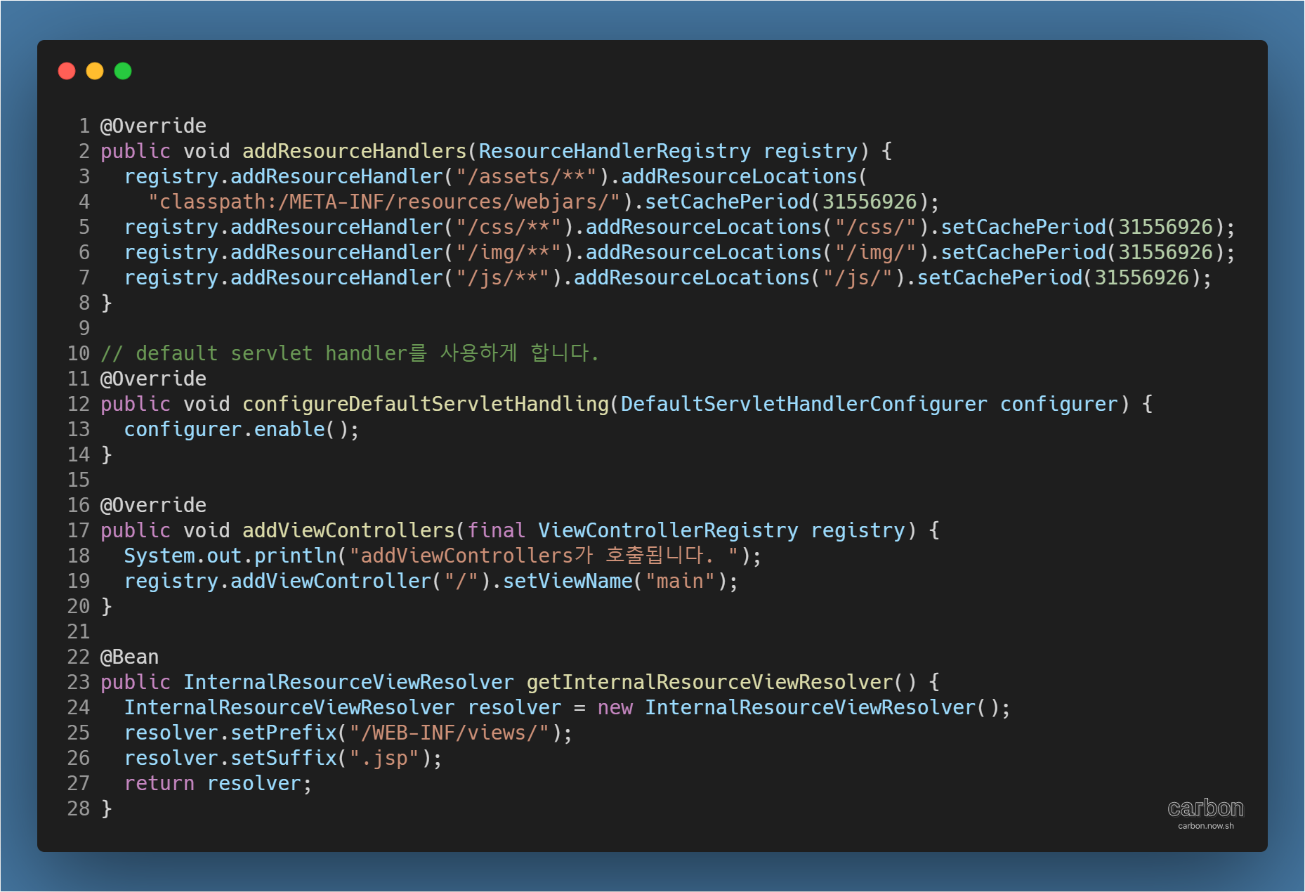 - 인자로 전달받은 DefaultServletHandlerConfigurer 객체에 enable( ) 메서드 호출