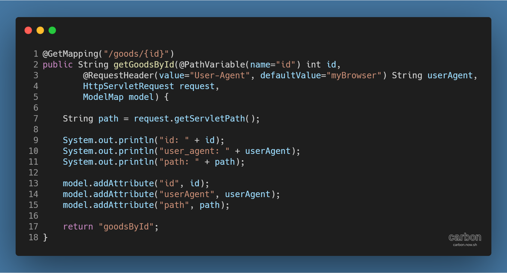 - 인자에 @RequestHeader를 붙여 헤더의 정보를 꺼내 변수로 지정할 수 있음
