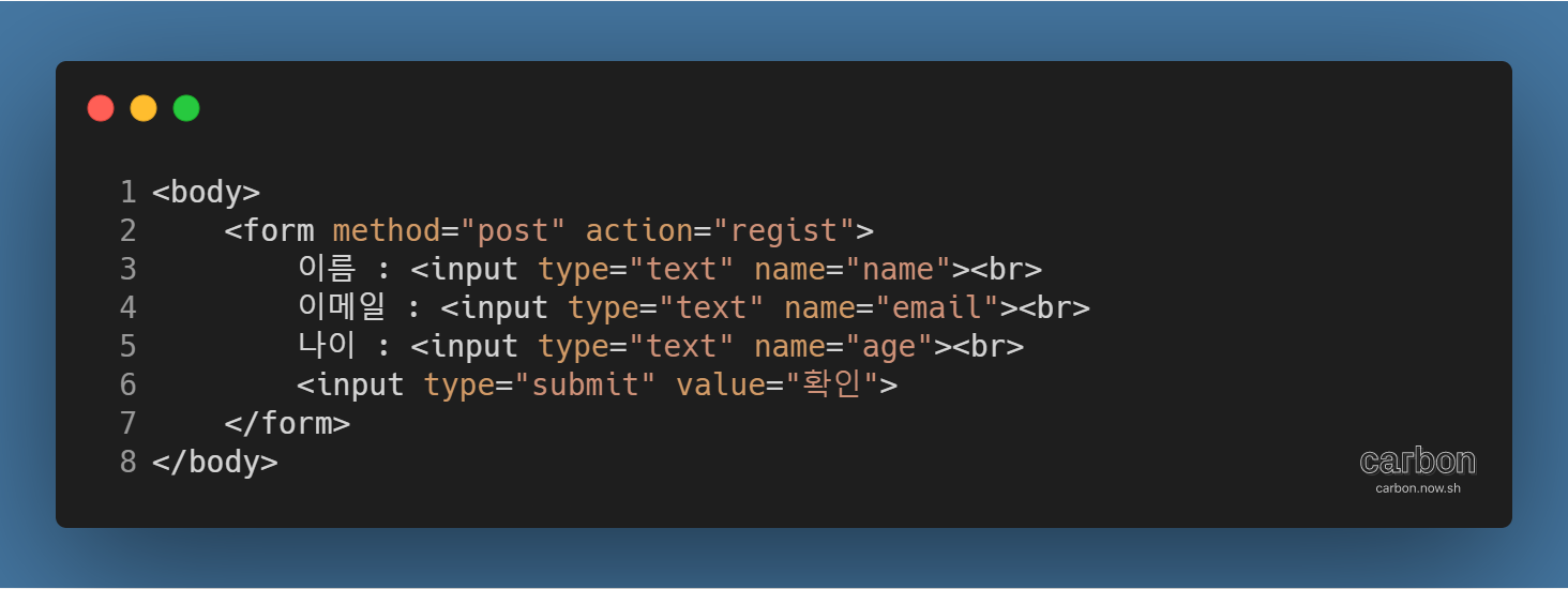 서버가 웹 브라우저에게 이름, e-mail, 나이를 입력받을 수 있는 입력창과 버튼이 있는 화면을 출력 - 웹 브라우저가 3개의 값을 입력하고 버튼을 클릭하면