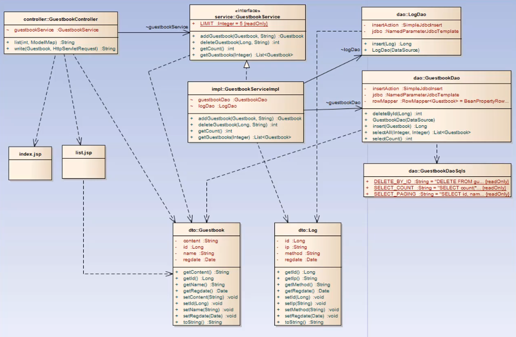 여기서 GuestbookServiceImpl 클래스는 logDao와 GuestbookDao를 사용해 비즈니스 로직을 수행하게 된다.