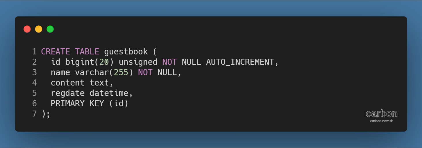- 방명록 정보(id, 이름, 내용, 등록일)를 guestbook 테이블에 저장