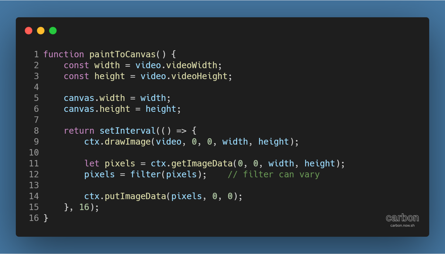캔버스에 투영된 이미지의 픽셀 데이터를 조작해서 필터 효과를 구현할 수 있다. 먼저 paintToCanvas( ) 함수를 다음과 같이 변경해야 한다.