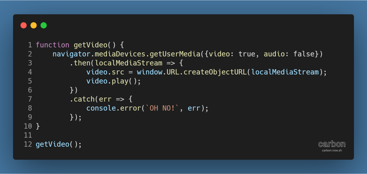 당신의 컴퓨터에 웹캠이 달려있다면, 웹캠의 화면이 브라우저에 나오도록 할 수 있다. 다음 getVideo( ) 함수를 보자.