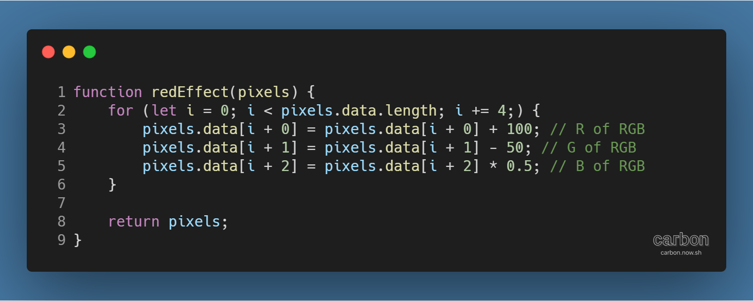 Red, Green, Blue, Alpha 4개의 원소가 하나의 픽셀을 구성하므로, R 픽셀의 값을 높이고 G, B 픽셀의 값을 낮춰 영상의 전체적인 색상을 붉은 톤으로 보이게 하는 방식이다.