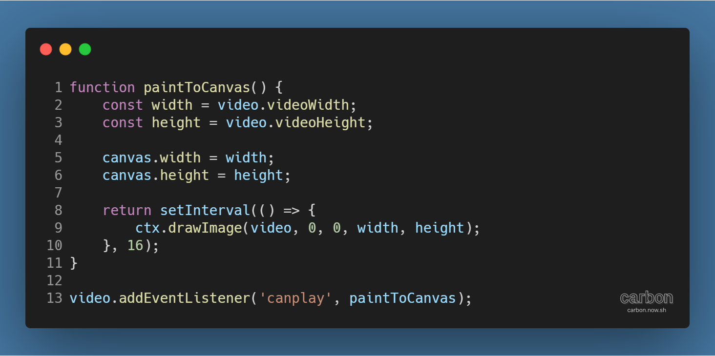 캔버스와 길이와 높이를 영상과 같게 한 뒤, drawImage( ) 메서드를 사용해 영상의 이미지 데이터를 캔버스 컨텍스트에 16ms 간격으로 입력한다.