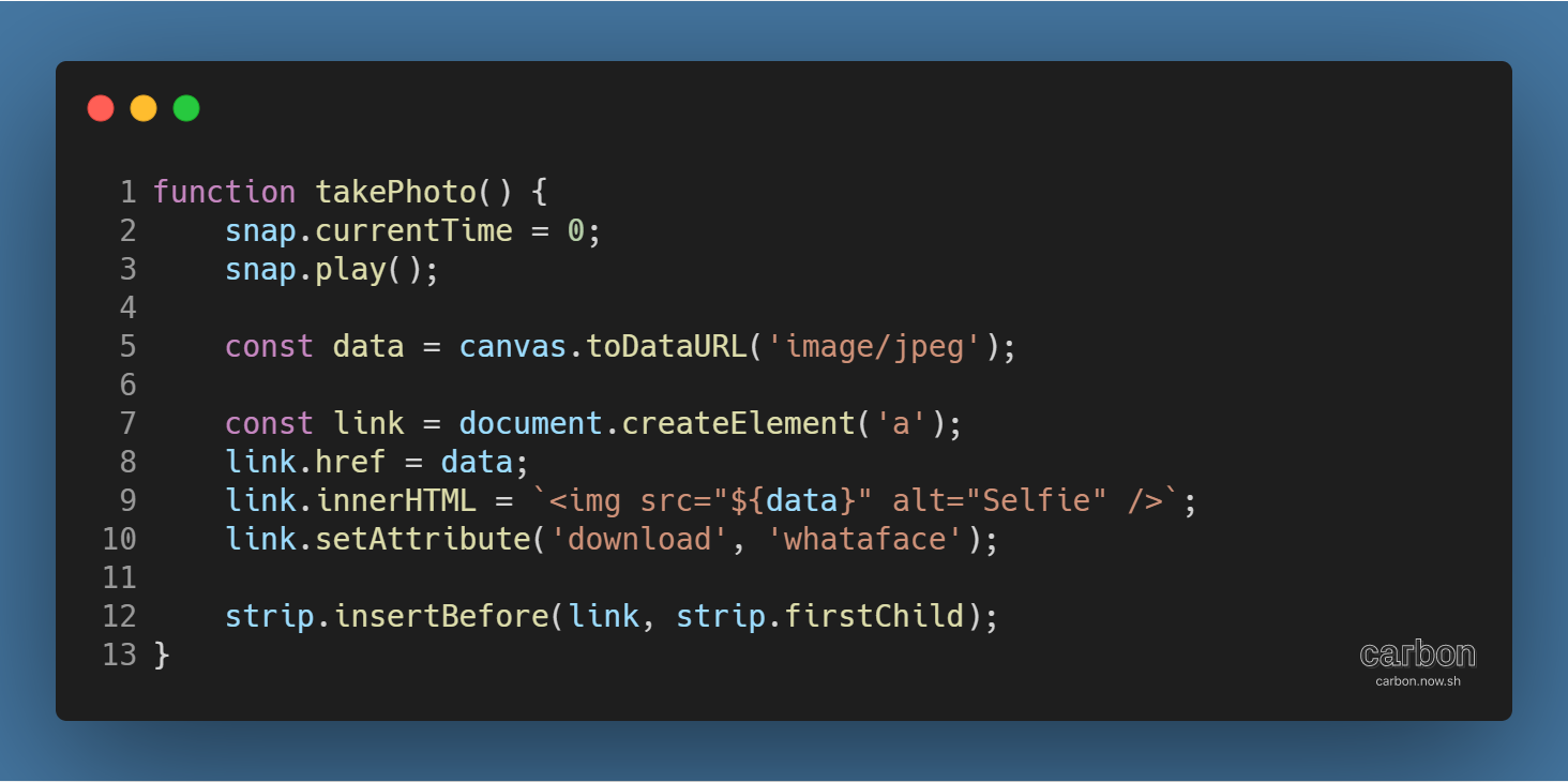 이처럼 재생되는 영상을 캡처해서 다운로드 하는 것도 가능하다. 아래 takePhoto( ) 함수를 보자.