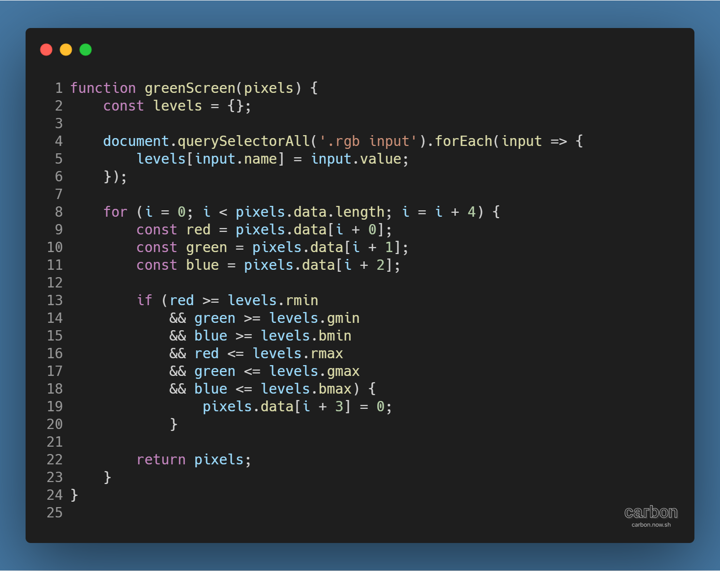 웹페이지의 슬라이더에서 R, G, B의 최소값과 최대값을 불러온 뒤, 각 픽셀의 R, G, B 값이 그 사이에 있을 경우 A 값을 0으로 만드는 방식이다.
