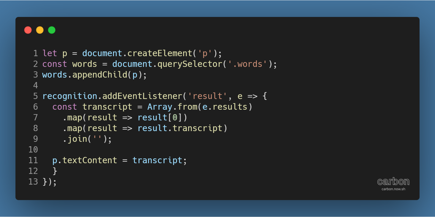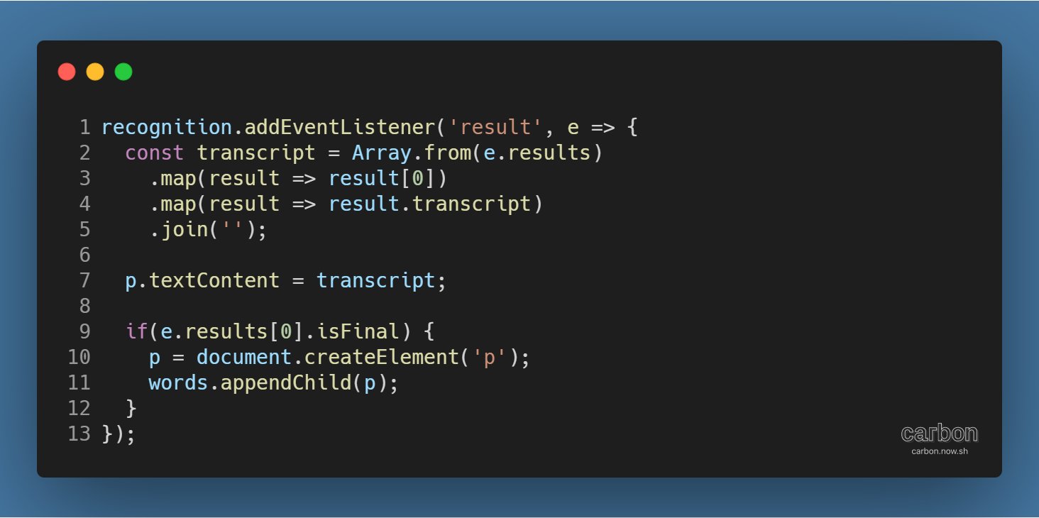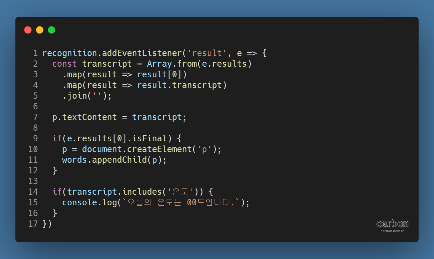 음성을 인식한 결과를 브라우저에 표시하는 것은 간단하다. 다음의 코드를 보자.