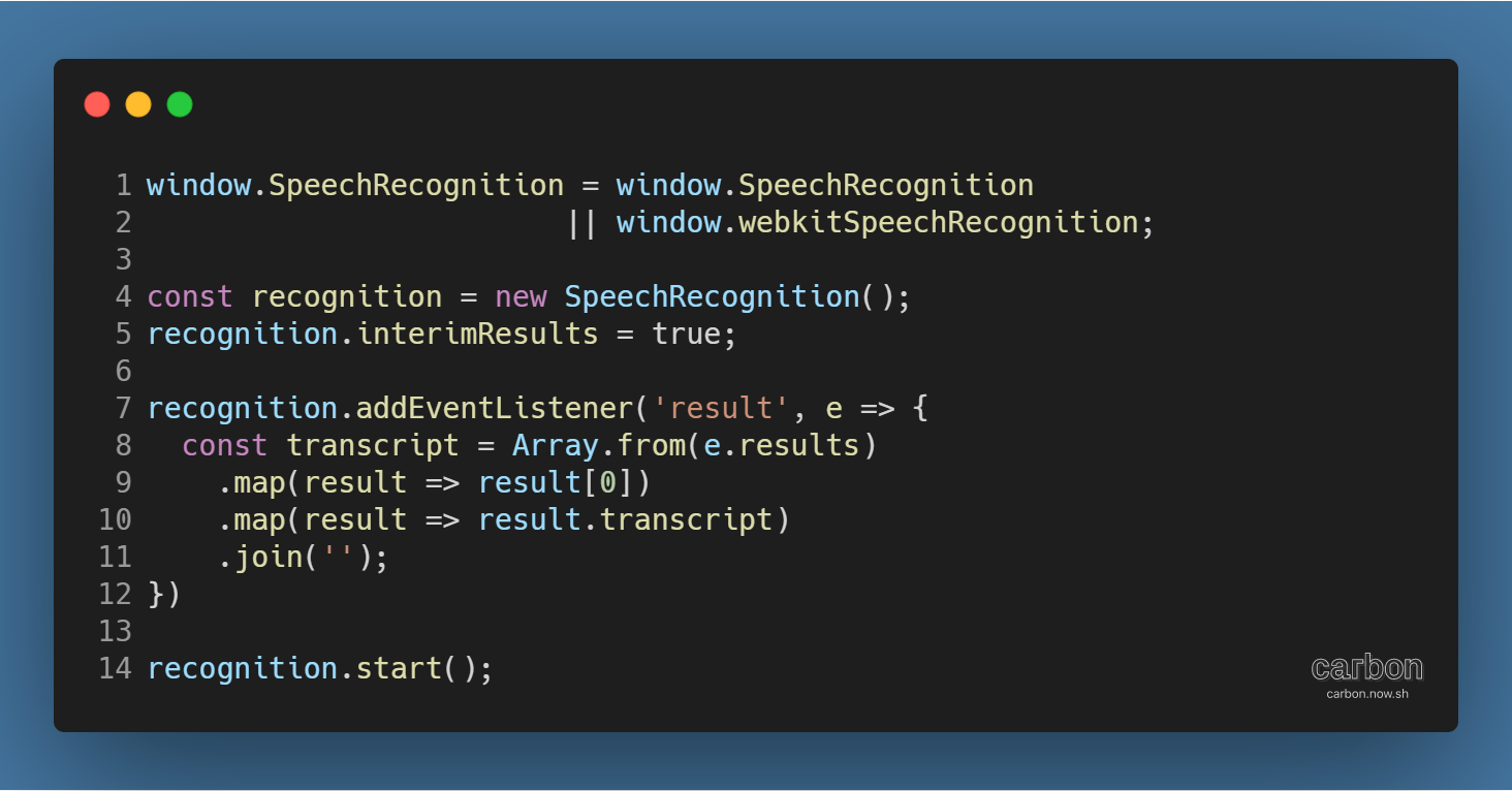 음성을 인식하게 해주는 SpeechRecognition 인터페이스1를 사용하고 있다. Google Chrome에서는 Vendor Prefix인 webkit을 붙여야 인터페이스를 인식하므로 || (or)을 사용해 설정해준다. SpeechRecognition 인터페이스의 사용 방법은 다음과 같다.