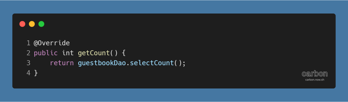 굉장히 간단하다. guestbookDao의 selectCount( ) 메서드가 방명록 건수를 조회해 반환하므로, 메서드의 실행 결과를 바로 반환하면 된다.