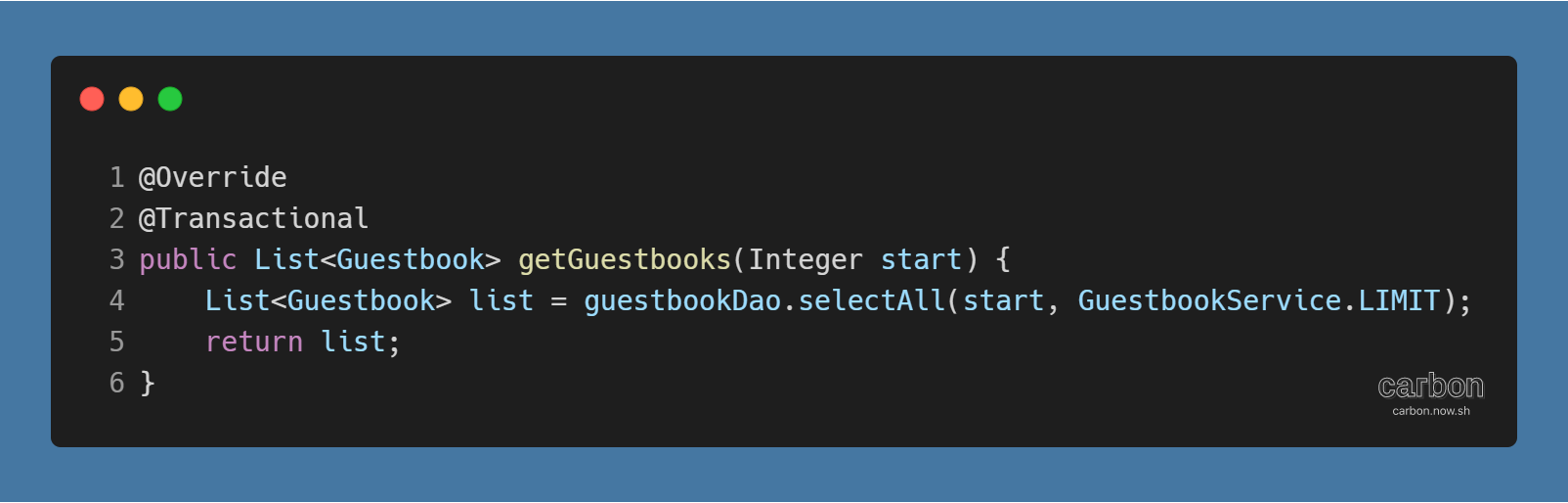 첫 번째는 방명록 정보를 일정 범위만큼 조회하는 getGuestbooks( ) 메서드이다. 아래 코드를 보자.