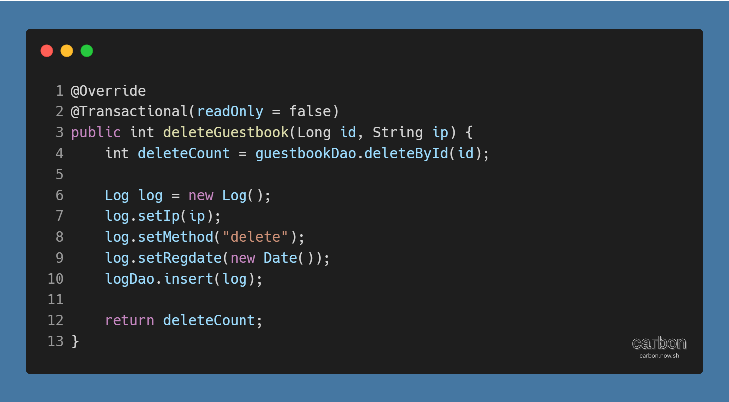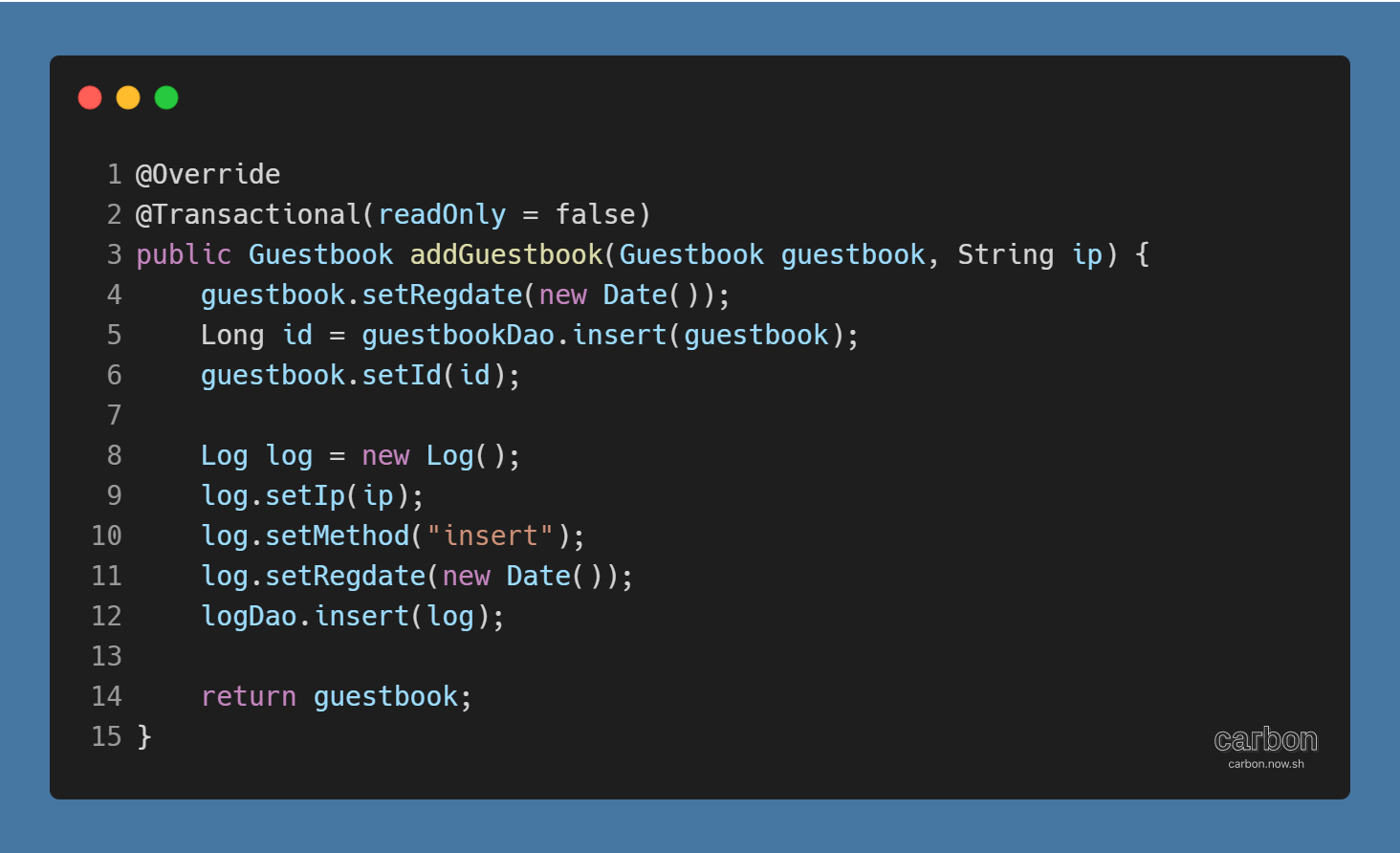 guestbook 객체의 방명록 정보는 대부분 컨트롤러가 사용자로부터 값을 받아 저장하지만, 등록일은 메서드가 실행되는 시점으로 직접 설정해줘야 한다. 그렇게 완성된 guestbook 정보를 데이터베이스에 입력하고, 반환된 id도 함께 저장한다. 입력이 이루어지면, Log 객체를 사용해 입력 정보를 데이터베이스 log 테이블에 입력한다.