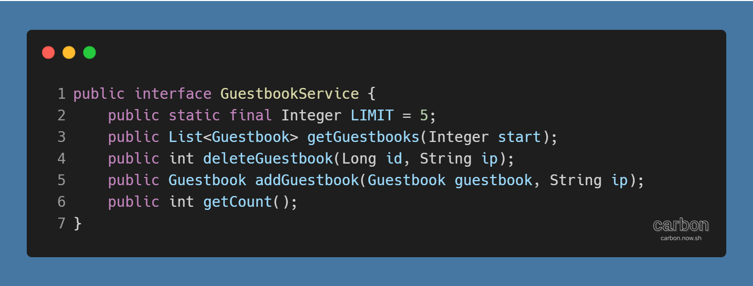 프로젝트 > Java Resources > src/main/java > kr.or.connect.guestbook.service 우클릭 → GuestbookService 인터페이스 생성 (각주[각주:1]의 코드 참고) → 한 페이지에 보여줄 방명록 건수를 상수[각주:2] LIMIT으로 지정 → 비즈니스 로직을 담당하는 메서드[각주:3] 선언[각주:4]