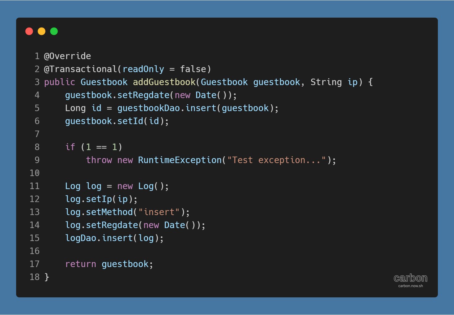 만약 @Transactional이 붙어있지 않은 일반 메서드였다면, guestbook 테이블에는 데이터가 입력되지만 log 테이블에는 데이터가 입력되지 않는다. 하지만 트랜잭션인 메서드이므로, guestbook 테이블과 log 테이블 모두에 데이터가 입력되지 않는다.