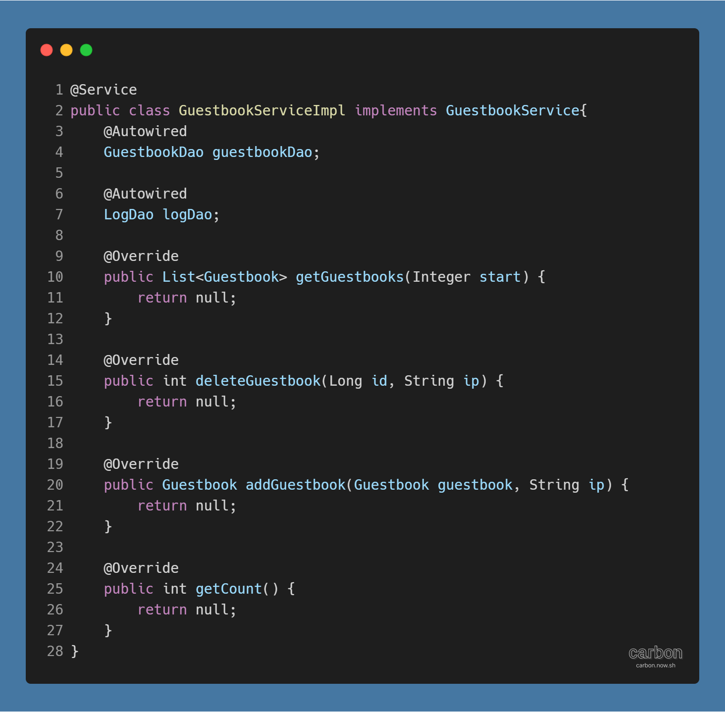 인터페이스를 만들었다면 실제로 인터페이스를 구현할 GuestbookServiceImpl 클래스를 생성한다.
