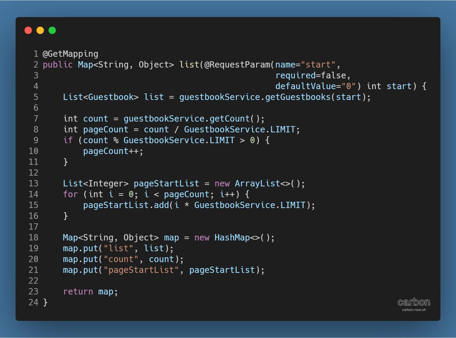 전체적인 구조는 GuestbookController의 list 메서드와 유사하나, View의 이름이 아닌 Map을 반환3하는 점이 다르다.