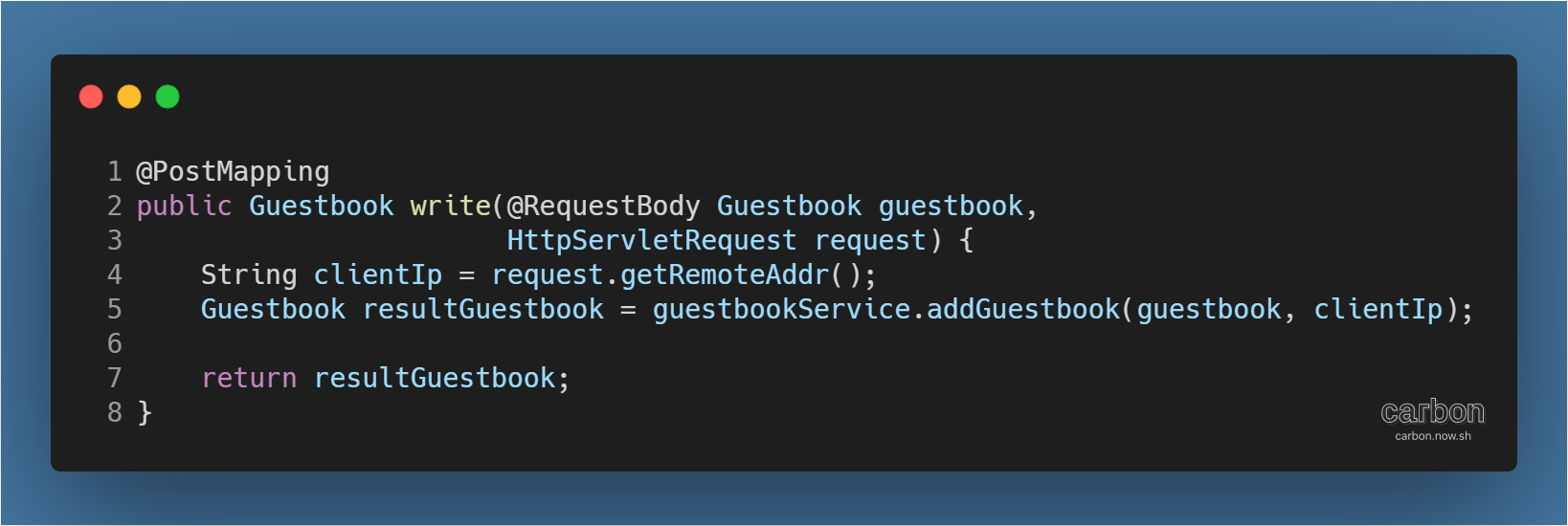 변환된 Guestbook 객체를 사용해 HttpServletRequest의 getRemoteAddr( ) 메서드로 불러온 사용자의 IP 정보와 함께 guestbookService의 addGuestbookService( ) 메서드를 실행한다.