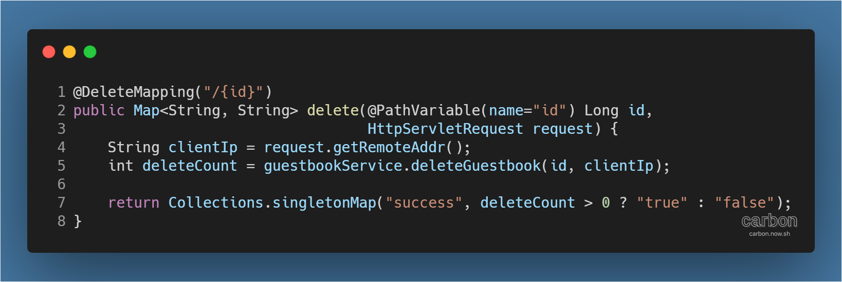 GET, POST 방식과 달리 @DeleteMapping 뒤 추가적인 path 정보가 있으므로 /guestbooks/{id} URL 요청에 대응하게 된다. 여기서 id란 이름으로 전달될 값은 @PathVariable을 입력해 변수로 사용4할 수 있다.