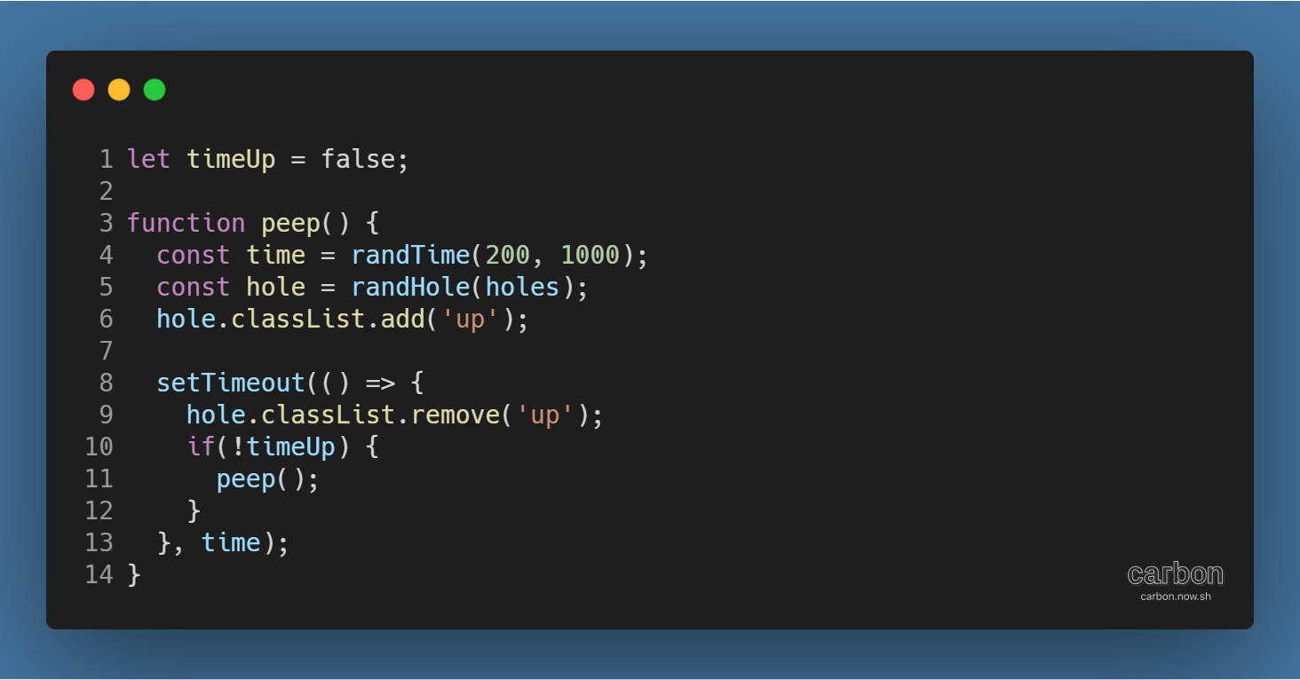 - setTimeout( ) 메서드를 사용해 무작위 시간 이후 두더지가 나올 구멍에서 up 클래스를 제거