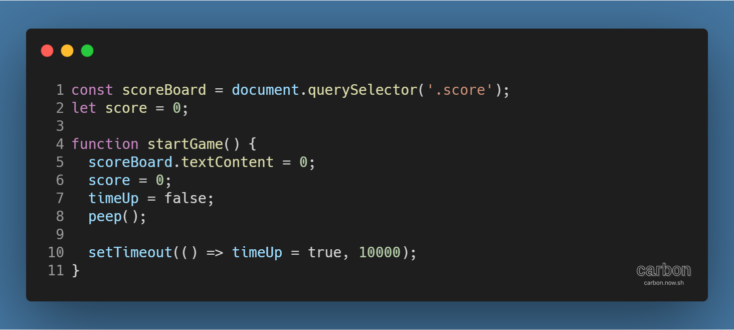 점수를 초기화시키고 게임을 시작하고 일정 시간 동안 지속시키는 startGame( ) 함수를 만듭니다. 다음처럼 작동합니다.