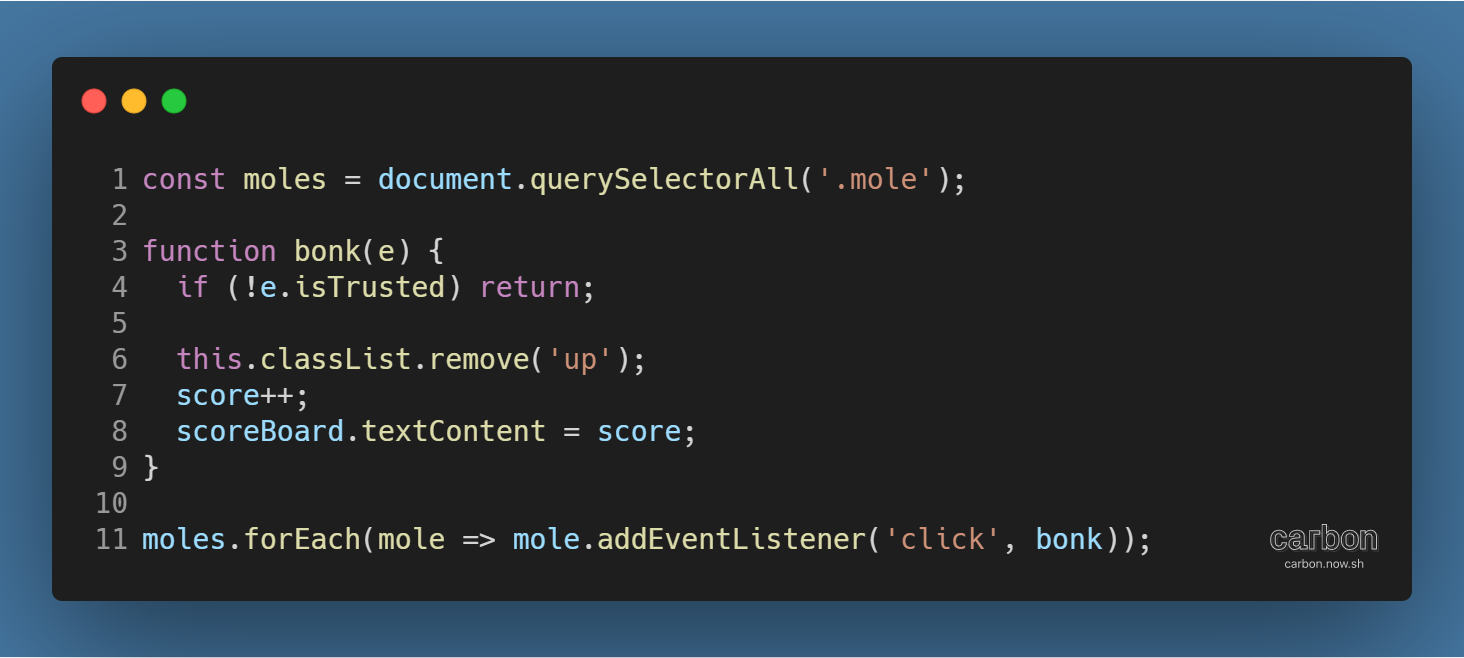 두더지를 잡는 bonk( ) 함수를 두더지 요소들에 마우스 클릭 이벤트로 연결합니다. bonk( ) 함수의 작동 방식입니다.
