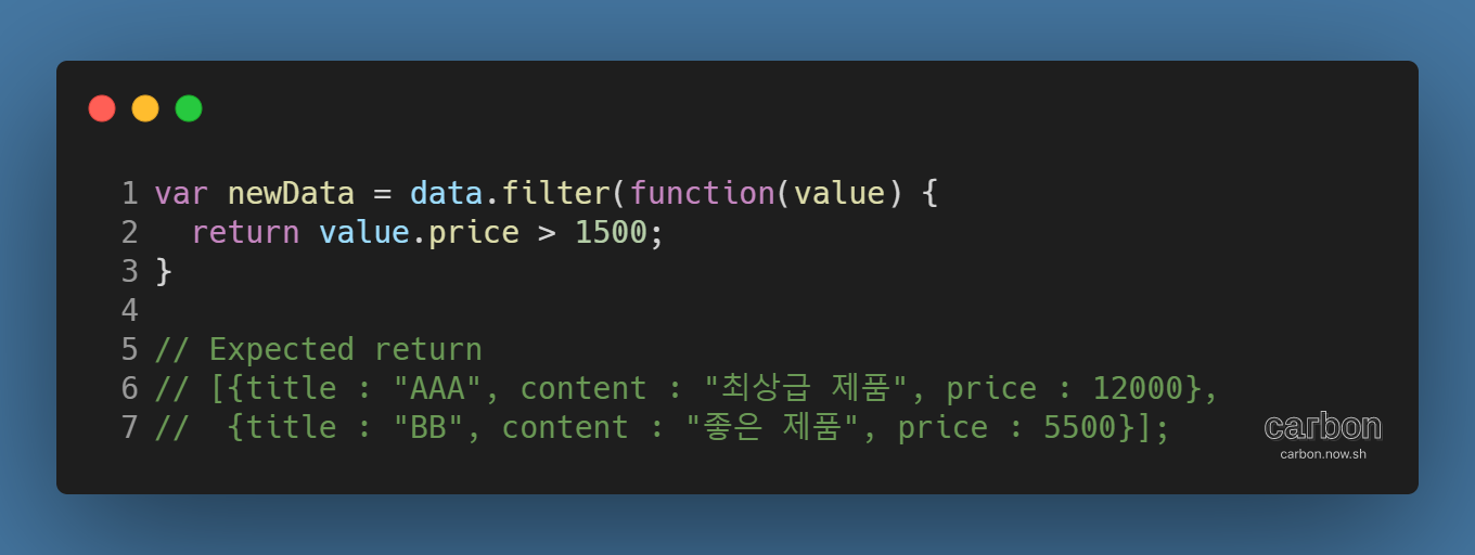 유사한 방식으로 작동하는 메서드로, filter가 있다. filter는 전달받은 함수의 조건에 부합하는 원소만을 추출한 새로운 배열을 반환한다. 가격이 1500 이상인 데이터만 추출하는 아래 예시를 보자.