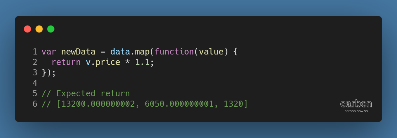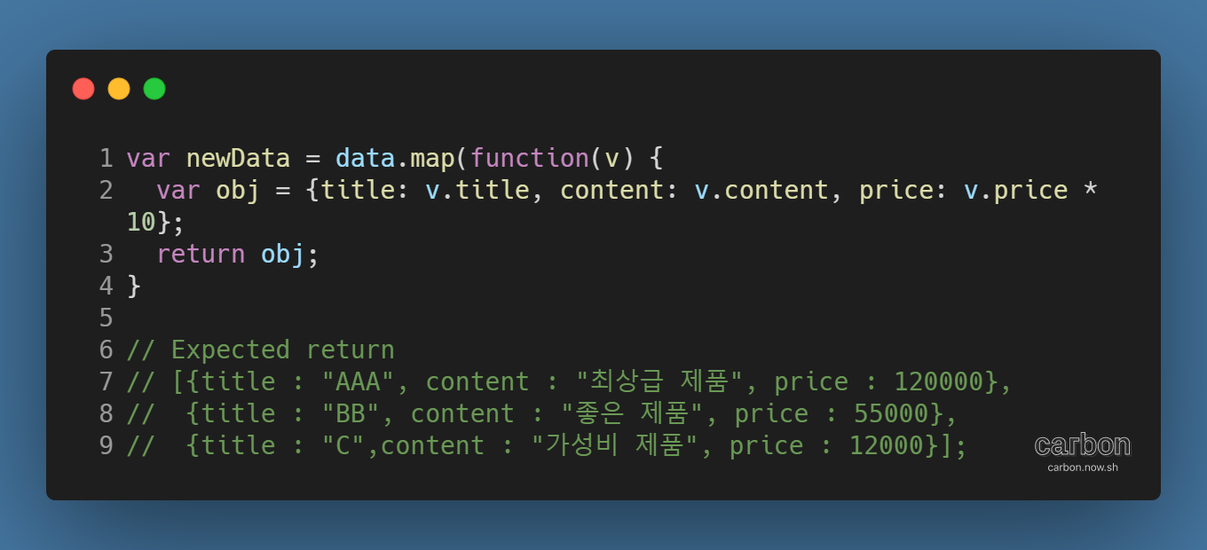 위의 data 배열로 돌아가, 각 데이터에서 가격을 일괄적으로 10%씩 인상하고, 인상한 뒤의 가격을 알고 싶은 상황을 가정하자. 이럴 때 map 메서드를 사용하면 된다.
