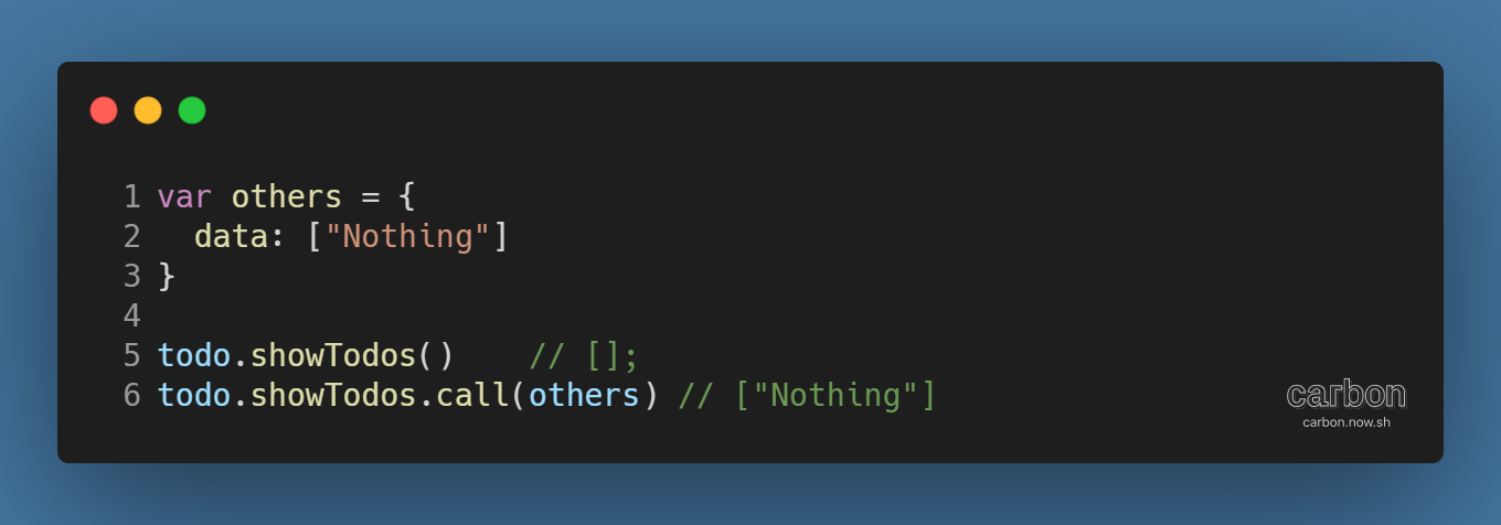 하지만 여기서 call 메서드를 사용해 others 객체를 연결하면 todo 객체의 data가 아니라 others 객체의 data를 출력할 수 있다.
