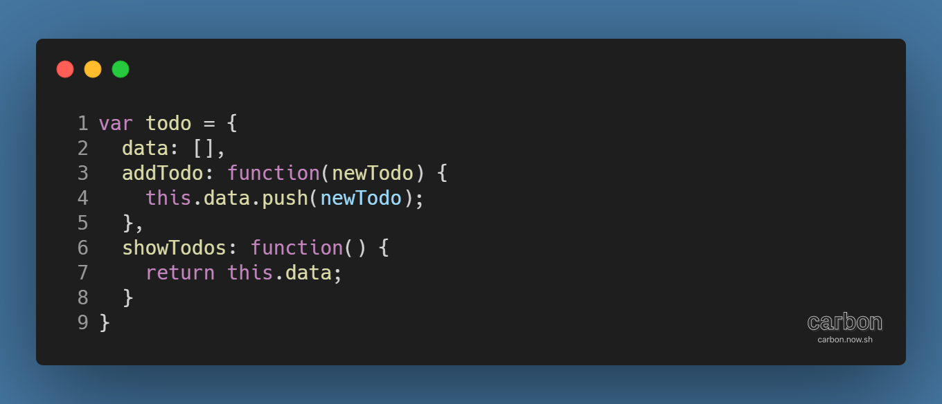 기존의 todo 외 others란 객체가 추가된 상황이다. 여기서 todo 객체의 showTodos 메서드를 실행하면 기존과 동일하게 todo 객체의 data를 출력한다.